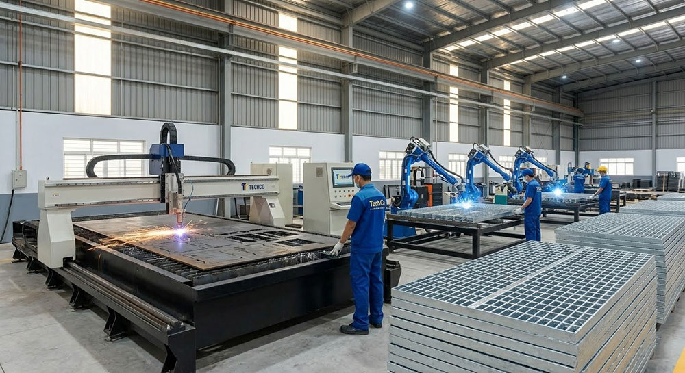 Sử dụng công nghệ tiên tiến: TechCo sử dụng các máy cắt CNC và máy hàn robot hiện đại, đảm bảo độ chính xác và tính thẩm mỹ cho từng tấm sàn grating. Việc sử dụng công nghệ giúp TechCo nâng cao năng suất và duy trì chất lượng ổn định.